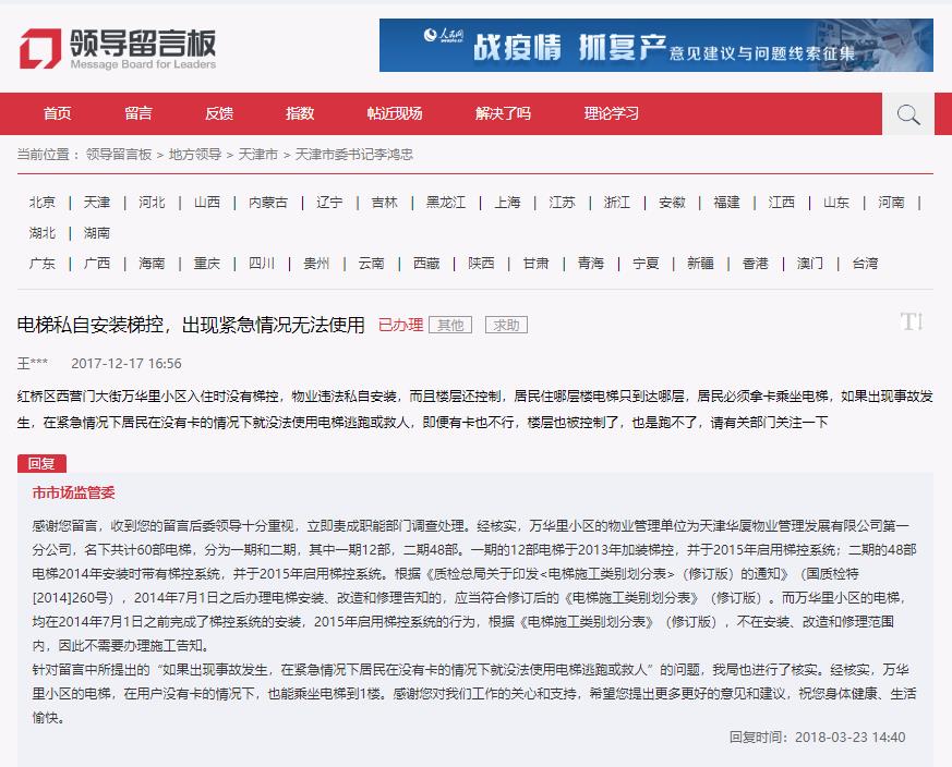 感謝您留言,收到您的留言后委領(lǐng)導(dǎo)十分重視,立即責(zé)成職能部門調(diào)查處理。經(jīng)核實(shí),萬華里小區(qū)的物業(yè)管理單位為天津華廈物業(yè)管理發(fā)展有限公司第一分公司,名下共計(jì)60部電梯,分為一期和二期,其中一期12部,二期48部。一期的12部電梯于2013年加裝梯控,并于2015年啟用梯控系統(tǒng);二期的48部電梯2014年安裝時(shí)帶有梯控系統(tǒng),并于2015年啟用梯控系統(tǒng)。根據(jù)《質(zhì)檢總局關(guān)于印發(fā)<電梯施工類別劃分表>(修訂版)的通知》(國質(zhì)檢特[2014]260號(hào)),2014年7月1日之后辦理電梯安裝、改造和修理告知的,應(yīng)當(dāng)符合修訂后的《電梯施工類別劃分表》(修訂版)。而萬華里小區(qū)的電梯,均在2014年7月1日之前完成了梯控系統(tǒng)的安裝,2015年啟用梯控系統(tǒng)的行為,根據(jù)《電梯施工類別劃分表》(修訂版),不在安裝、改造和修理范圍內(nèi),因此不需要辦理施工告知。