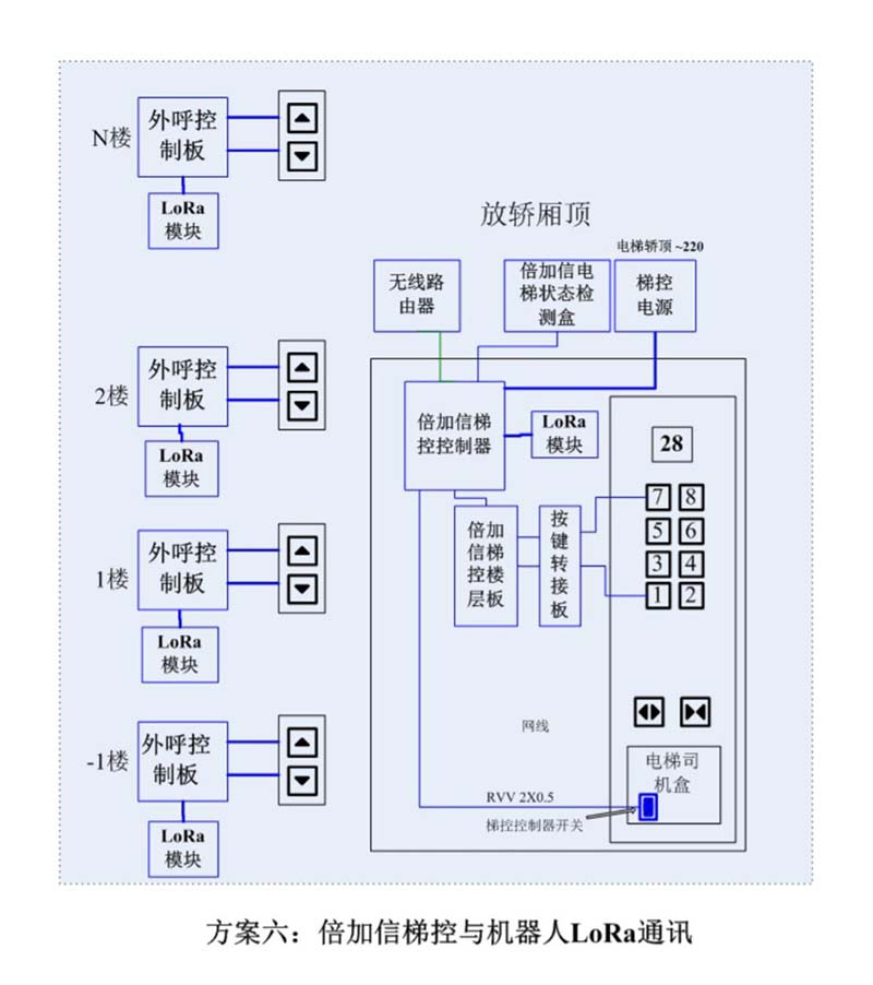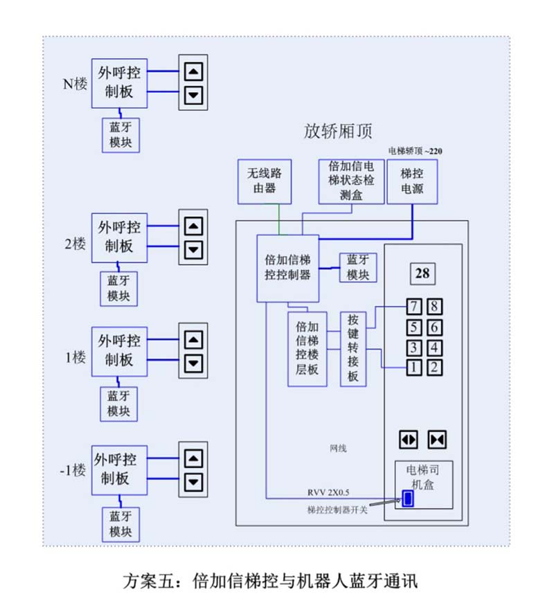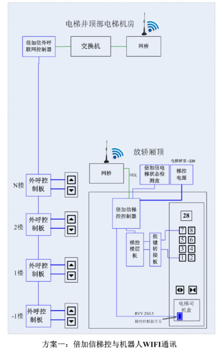 (1)機(jī)器人在電梯外,通個(gè)Wifi或4G網(wǎng)絡(luò)發(fā)送指令給倍加信梯控平臺(tái),倍加信梯控云平臺(tái)收到指令后,將指令發(fā)給倍加信梯控系統(tǒng),倍加信梯控系統(tǒng)自動(dòng)點(diǎn)亮上樓或下樓按鍵,實(shí)現(xiàn)呼梯功能。