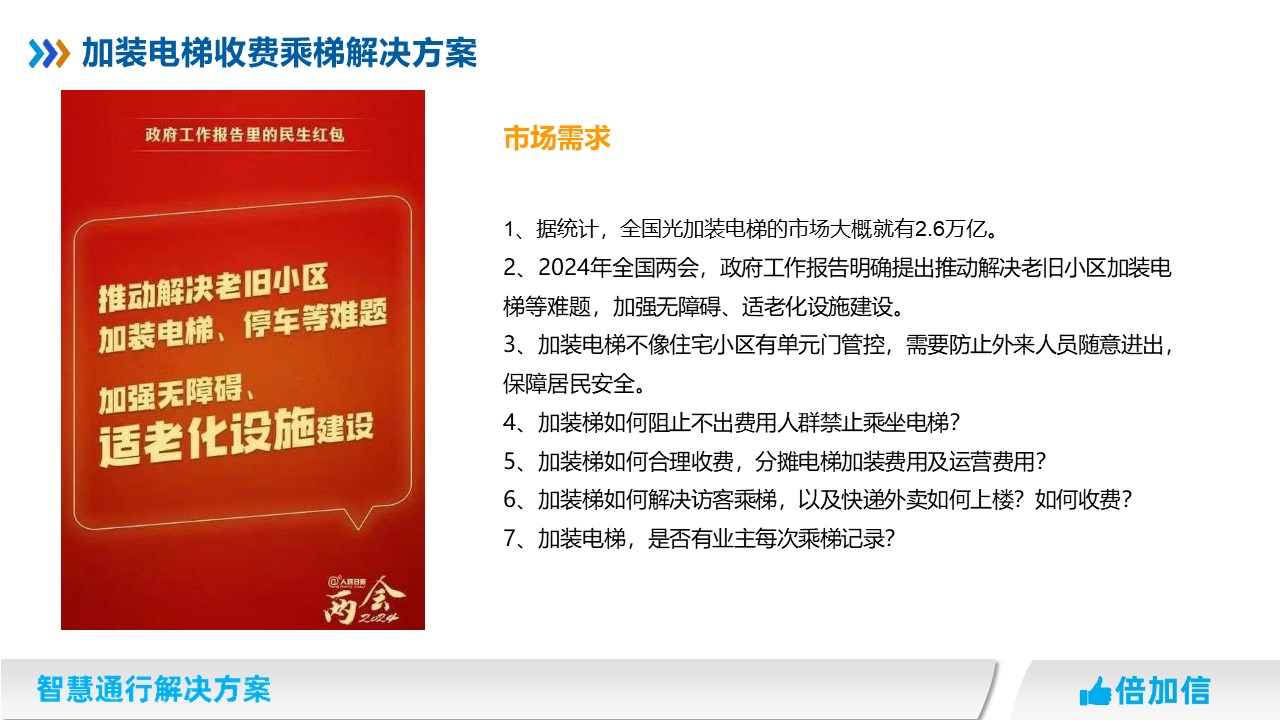 老舊小區沒有電梯,上下樓難一直困擾居民生活,2024年全國兩會,政府工作報告明確提出推動解決老舊小區加裝電梯等難題,加強無障礙、適老化設施建設,加裝電梯需要安裝梯控設備需求大,功能不同于普通梯控系統。
