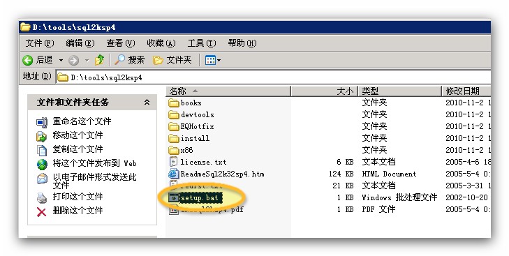 解壓sql2ksp4.rar這個壓縮包到當前路徑,點擊setup.bat進行安裝,注意很多人把解壓當成安裝,解壓了并不是安裝,一定要注意,解壓后需要到解壓目錄下執行安裝。
