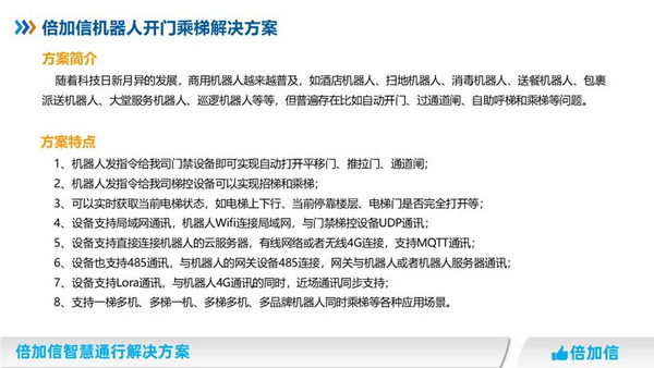 倍-加-信-科-技的智能電梯無感接入解決方案,一方面可以響應(yīng)多種機器人(保潔、配送、消毒、藥品配送、迎賓、安防機器人等)的長距離乘梯請求。)并智能調(diào)度電梯,從而解決樓宇內(nèi)機器人自主乘坐電梯的智能垂直交通需求。