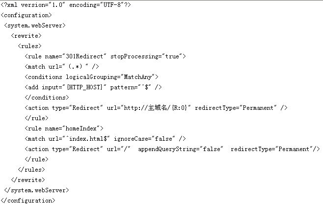 然后就是基于windows平臺下的301重新定向。因為windows平臺下的IIS和Linux的平臺存在著一定的差別,對此需要和IDC供應(yīng)商進(jìn)行商討,了解基于windows平臺下的IIS配置。在windows平臺下,可以在根目錄下創(chuàng)建一個web.config文件,然后在這個文件中輸入下面的代碼,具體如下圖所示。