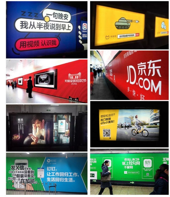 簡單配色、重復(fù)表達。網(wǎng)易云音樂、知乎、陌陌、美團、京東都用,產(chǎn)品代表色來進行地鐵刷屏,長時間內(nèi)大量重復(fù),可以讓人將品牌與顏色畫上等號,進而達到占領(lǐng)消費者心智的目的。